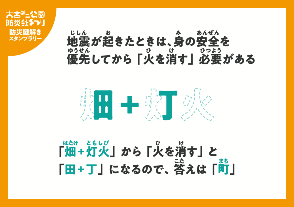 防災謎解きスタンプラリー回答 11/2,3イベント当日は楽しい問題がたくさんあるので、是非遊びに来てくださいね! 「ちょいむず」コース(本例題よりもやさしい問題)と「難解」コース(本例題と同等レベルの難易度)を用意しています。